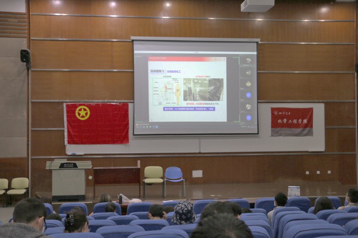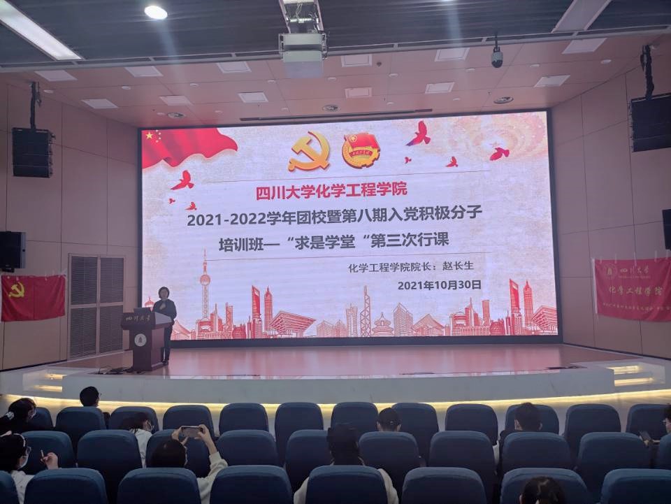 院长赵长生教授,主题为“弘扬‘红船精神’ 努力成为一流化工创新人才”。与会嘉宾有党委副书记姜利寒老师、团校指导教师老师李珍珍、党校指导教师雷金凤。根据疫情防控相关要求,本次行课由线下会场与线上转播同步进行,会场同学全程佩戴口罩,隔位就坐,秩序井然。