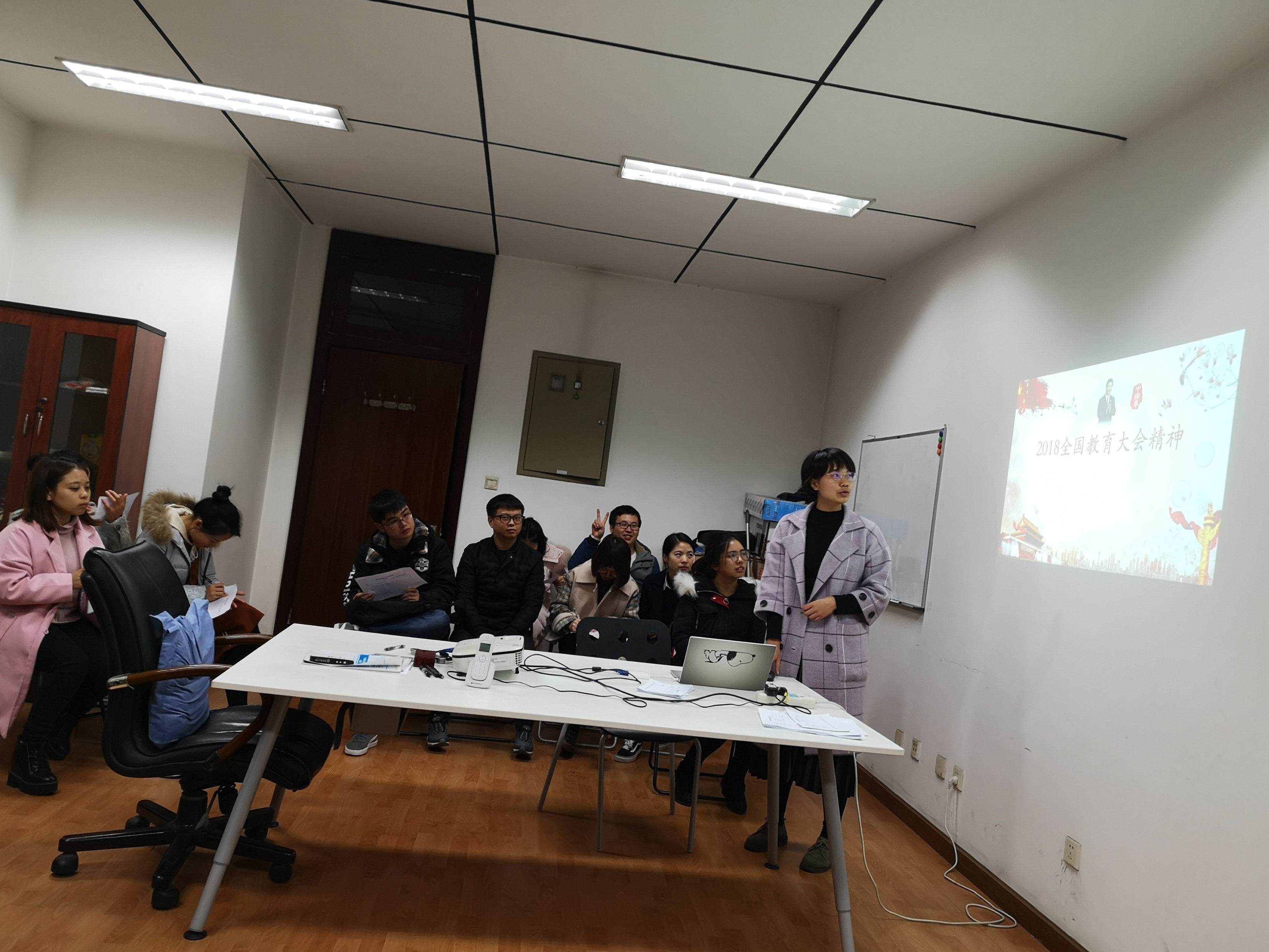 江安校区第一基础教学楼B316开展学习习近平总书记在全国教育大会上重要讲话内容和发展党员专题会议。本次大会应到党员30人,实到党员27人,会议由支部副书记杨柯同志主持。
