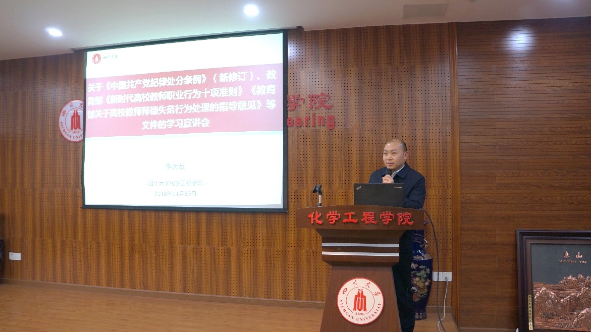 党委副书记、纪委书记李天友为全院教师宣讲新修订的《中国共产党纪律处分条例》(以下简称《条例》)、教育部《新时代高校教师职业行为十项准则》(以下简称《十项准则》)和《教育部关于高校教师师德失范行为处理的指导意见》(以下简称《意见》)。NT动漫