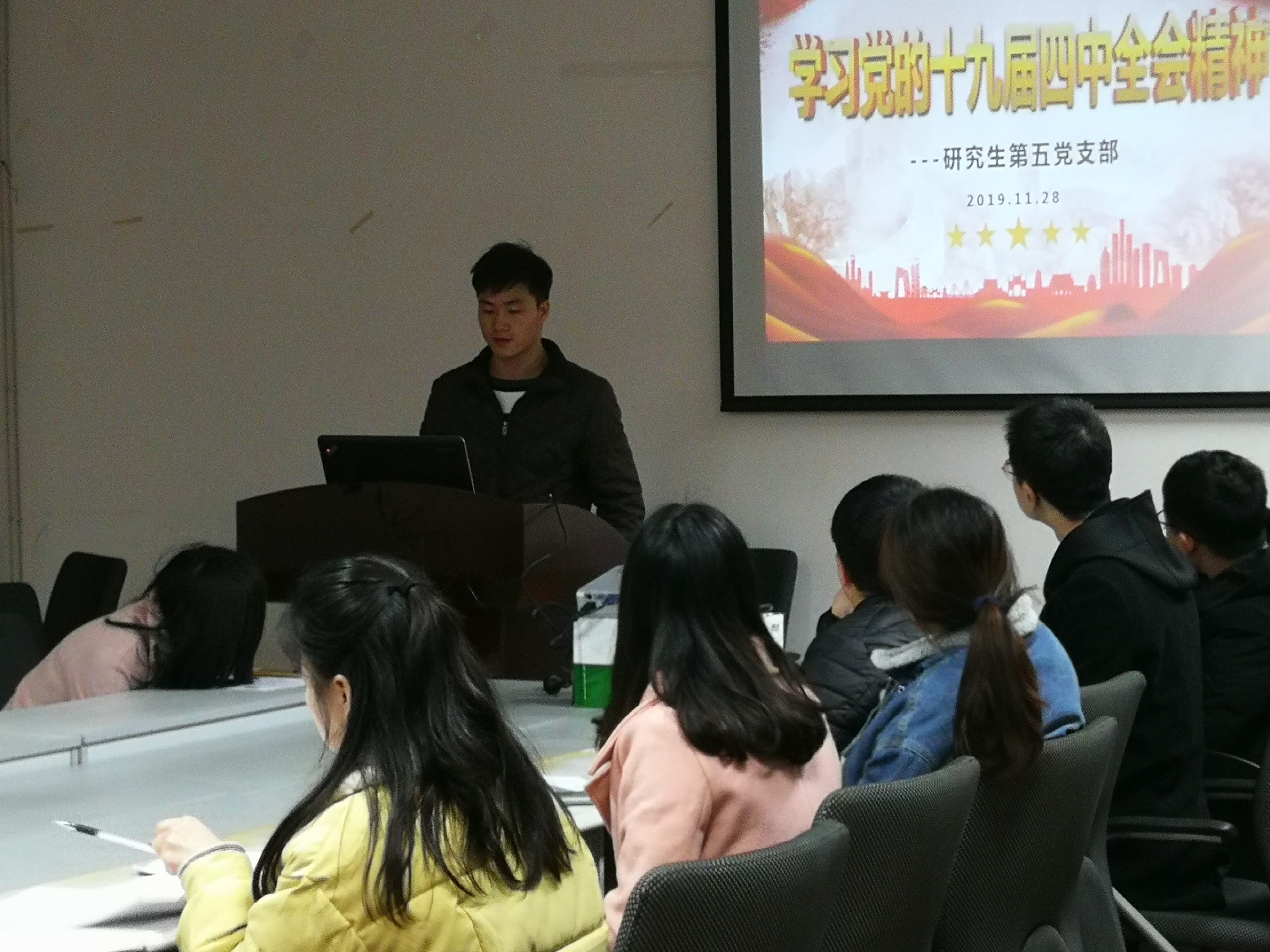 2019年11月28日,学院研究生第五党支部于在江安校区一基楼B218开展了以“学习党的十九届四中全会精神”及参观“新中国成立70周年成就展网上展馆”为主题的组织生活会,会议由支部书记袁科主持。