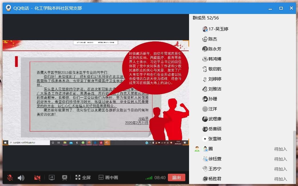 本科社区党支部在党员QQ群开展了第一期线上党组织生活,53名学生党员全部踊跃参加。大家在群内签到后,在线学习了:(1)习近平总书记在统筹推进新冠肺炎疫情防控和经济社会发展工作部署会议上的讲话;(2)习近平总书记给在首钢医院实习的西藏大学医学院学生的回信;(3)《中共教育部党组关于统筹做好教育系统新冠肺炎疫情防控和教育改革发展工作的通知》;(4)《中共教育部党组关于学习贯彻习近平总书记给在首钢医院实习的西藏大学医学院学生重要回信精神的通知》等。同时在线分享了蹇萍秋同志《关于学习习近平总书记应对防疫工作的重要讲话和指示精神汇报》的PPT以及观看了新冠疫情的微视频。