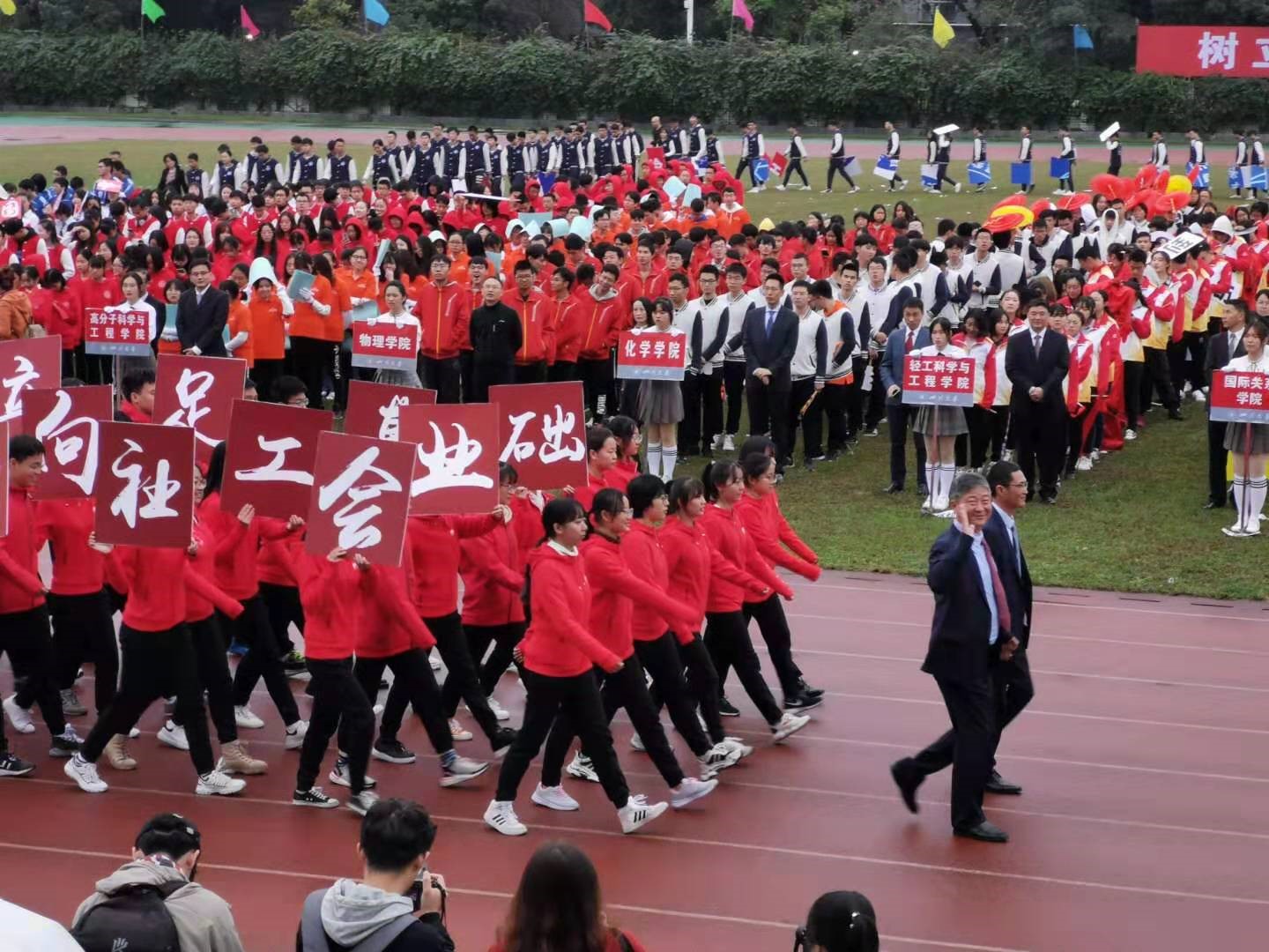 方阵由党委书记庞国伟和院长赵长生领队。同学们踏着整齐的步伐依次步入会场,他们精神饱满、气宇轩昂,“立足基础、面向工业、服务社会”12个字更是体现了化工的优良传统和川大化工人良好的精神面貌。