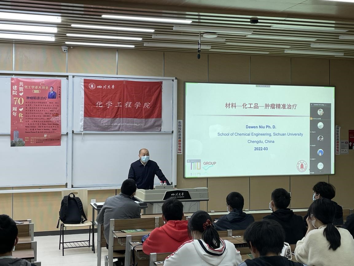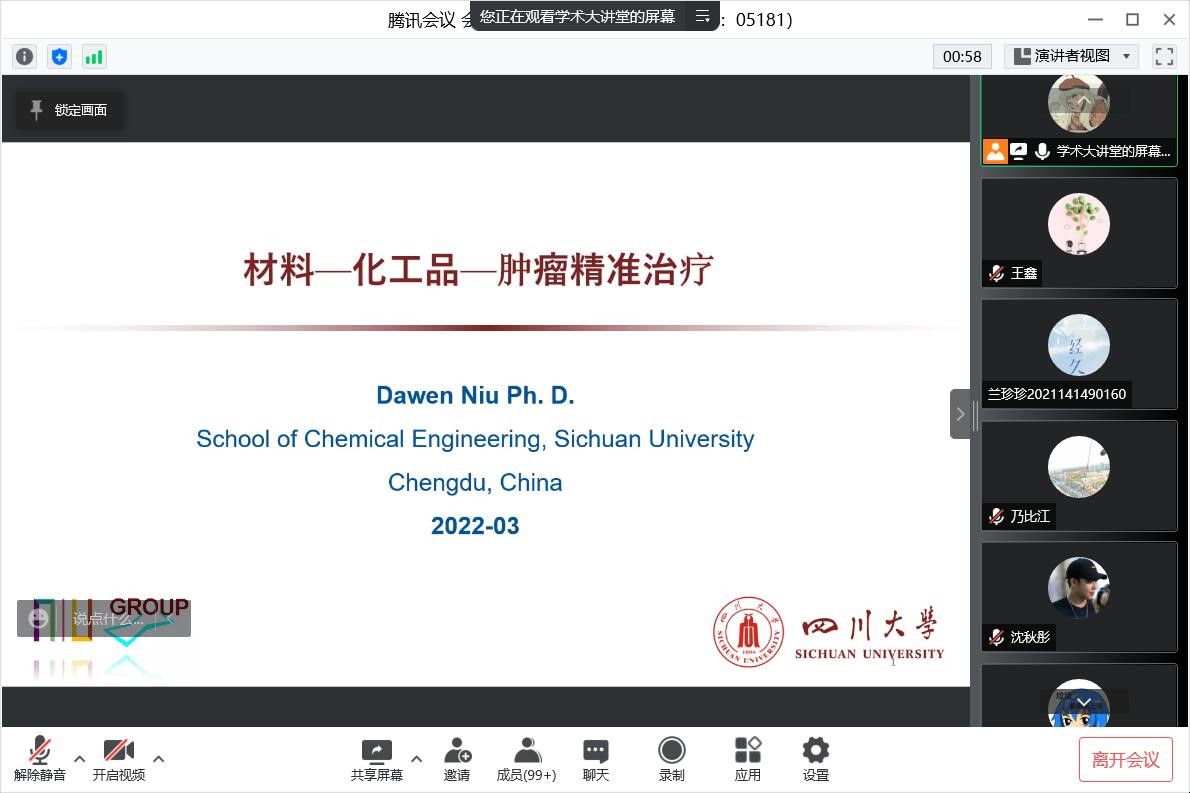 江安校区综合楼C座C507顺利开展。为了做好疫情防控工作,本次讲座采用线下交流和线上会议直播的形式,50人线下参与讲座,其余同学参与线上腾讯会议。主讲人钮大文教授为同学们带来了主题为“材料-化工品-肿瘤精准治疗”的精彩讲座,此外本次讲座还邀请了NT动漫