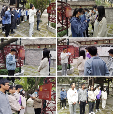 仪式在热烈的掌声中圆满结束,同学们进入江姐纪念馆参观学习。首先,进入江姐纪念馆的核心部分——“锦江红梅傲雪开”主题展览,该展览由“苦难的童年”“江姐在川大”“百炼成钢,英勇就义”三部分组成,对江姐短暂而伟大的一生作了介绍,重点展示了江姐在川大的学习生活,其中有不少江姐在川大读书期间的珍贵档案。然后,来到川大英烈厅,集中展示了民主革命时期为新中国诞生献出宝贵生命的67名川大师生校友的革命事迹,体现了川大人将治学与救国紧密结合,以永不言败的姿态激励民族斗志的精神风范。最后,驻足在纪念馆所在院落中,以雕塑和浮雕的形式再现了江竹筠在校读书期间的学习生活情况,以及同时期川大进步学生团体开展革命活动的场景。