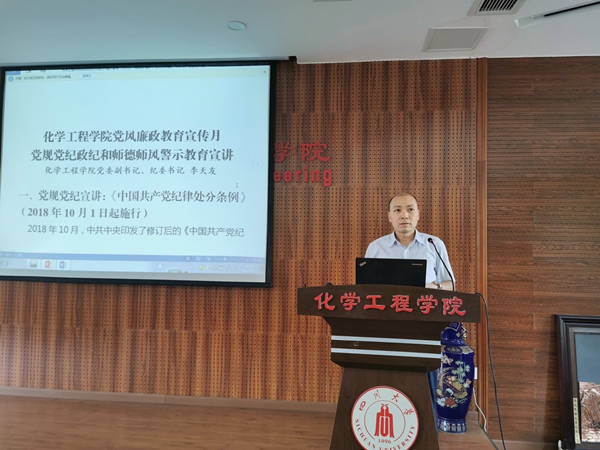 受钮大文副院长委托,学院院长助理吉俊懿结合《科研诚信案件调查处理规则(试行)》和国家自然基金委挂职锻炼经历,对科技部和国家自然基金委关于科研诚信的规定和案件处理程序进行了详细解读,并结合近几年高校出现的学术不端案例,教育引导广大教职工规范开展科研工作,严格遵守科研诚信,坚决杜绝学术不端现象,以优良科研作风开展科技工作,为学校“两个伟大”建设贡献化工力量。